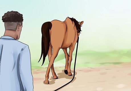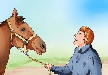 Prevent the horse from walking ahead of you. If the horse tries to walk ahead of you while you are leading him, stop moving. Once the horse stops, walk ahead. This establishes you as the leader. If the horse keeps walking too quickly, slow your pace to keep the horse calm. Keep a firm hand on the lead rope, but do not yank it.