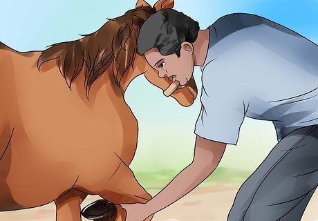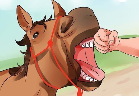 Respond to biting. If the horse tries to bite you, knock his teeth with your knuckles. Stare at him and scold him in a low, serious voice. Do not yell. A smack on the neck or rear is also an appropriate response to this kind of behavior.