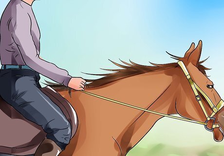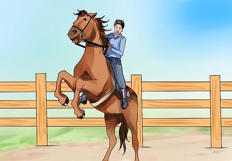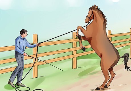 React to rearing. If the horse rears or tries to break free of your lead rope, do not let him go unless you need to for safety reasons. If you are on the ground, lightly and repeatedly pull the lead rope until he stops. If you are riding, grip the horse with your thighs to stay in the saddle. Scold the horse for a couple seconds in a low tone. If you're riding the horse when it rears, it can also help to lean forward, keep your heels down, and keep your torso long. Don't forget to breathe, too! If you cannot safely stay on the horse, learn how to avoid injury when falling.