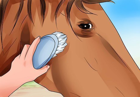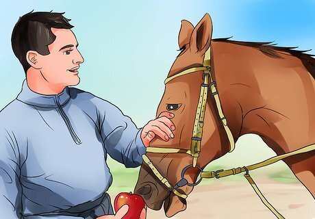 Reward calm behavior. When the horse calms down or responds to your commands, reward it by patting its neck or shoulder, speaking in an encouraging tone, and giving it a treat. This will teach the horse to stay calm in order to get the reward. This applies whether you are riding the horse or standing near it.