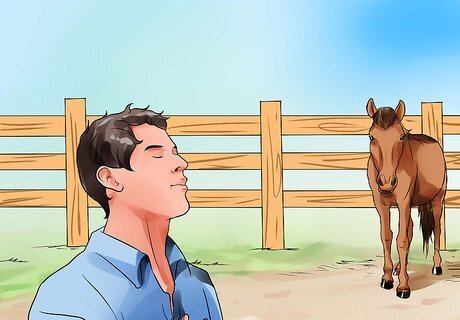 Stay calm. Horses can sense your fear, which can make the horse nervous or poorly behaved. Speak in a calm, quiet voice, and avoid flinching, shouting, and other anxious behavior. If you are sweating nervously or your heart is pounding, stay back. Watch the horse from a distance and take slow, deep breaths to relax yourself. Think happy, calm thoughts. As you calm down, approach a couple, slow steps at a time. Keep an eye out for signs that the horse is anxious or uncomfortable. A frightened horse may have flared nostrils, tense muscles, and very wide eyes. They might also have their eyes pinned back against their head.