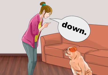 Teach your dog to stay off the furniture. Another way you can encourage your dog to leave you and your partner alone during intimate moments is to teach your dog to stay off furniture like your bed or your couch. Not allowing your dog on the furniture can help to set clear boundaries and let them know that you are in charge. This way, your dog is already aware that the bed or the couch is off limits for them and that they cannot get involved in anything that happens on these spots. You can teach your dog to stay off the furniture by pointing at the ground and saying “down” to your dog until they get off the bed or the couch. Once they sit on the floor, you can reward them with a treat. You should reinforce this rule in your home by not allowing your dog to go on any furniture, whether there is company over or not. Make sure other members of your household also uphold this rule.