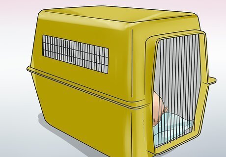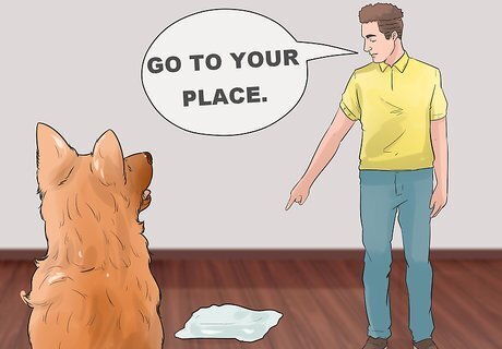 Send your dog to their crate. If your dog becomes protective and riled up when your partner is over or physically close to you at home, you should consider sending the dog out of the room. Tell your dog to go to their crate, if it is inside and nearby. You may put the crate in another room and say, “go to your crate” or “out.” You can also lead the dog to their crate and keep them in there while your partner is over so they are not able to see you or get physically close to you both. Keeping your dog in their crate may be a temporary solution, especially if your partner is over often and you do not want to confine your dog in their crate for a prolonged period of time. You may try other obedience techniques with your dog, such as a “calm down” command or a “go to your place” command once your dog understands the “out” command.