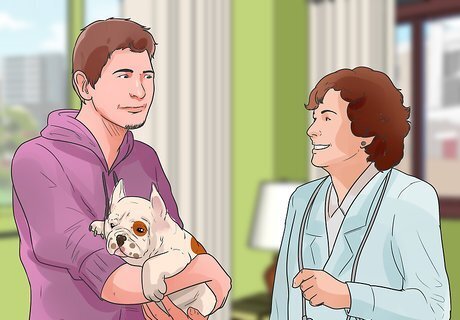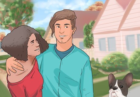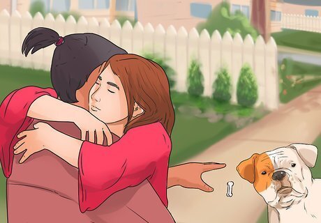 Start by hugging and touching in front of your dog. Another tactic is to try to get your dog used to your partner being around and close to you. To do this, start with some basic physical touching in front of your dog, such as hugging and holding hands. As you do this, give your dog a treat. Continue hugging and holding hands, moving closer together, while you give your dog another treat. Giving your dog treats while you are physical with your partner will show them that this interaction is a good thing and not a cause for concern. It will also let your dog know that you approve of the touching and are not in any danger.