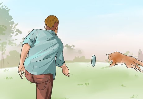 Distract your dog with a toy. If your dog becomes anxious or upset when you are touching your partner, have their favorite toy close by. Have a short play session with your dog using the toy and involve your partner. This will let your dog know that your partner is friendly and fun to be around, rather than a threat. You should both play with your dog for a few minutes, throwing the toy around. Then, throw the toy in a separate room and give your dog a treat. Your dog may be tired out and willing to leave you two alone after the play session is over.