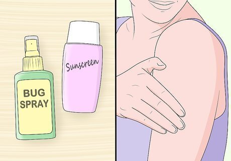 Apply bug spray and sunscreen every 2 hours while hiking. Look for bug spray that has DEET since it helps repel mosquitoes, flies, and ticks more efficiently. If the sun is out, get sunscreen that’s at least 30 SPF and rub it into any exposed skin. Reapply the bug spray and sunscreen about every 2 hours since the other applications will sweat off. You can also wear a hat and sunglasses to keep the sun out of your eyes. Check your legs and pants for ticks if you walk through tall grass.