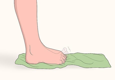 Try foot exercises to prevent sprains and aches. Spread a towel flat on the floor and set your foot on top of it. Keep your heel still and grab the towel with your toes. Pull the towel closer toward your heel before stretching your foot out again. Do this 5 times with each foot. You can also pick up marbles with your toes and drop them into a cup as an alternative way to stretch your arches. If your feet get sore, lay a cold bottle horizontal on the floor and roll your foot over it.