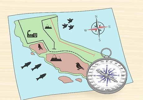Take a map and compass in case you get lost. Even if you have a GPS on your phone, you may need to use a map in an emergency. Try to find a topographical map of the area so you can easily locate landmarks and trails. Make sure you have a compass so you can determine which direction you’re facing. You can usually get a trail map at a park ranger’s stations or a visitor center. As a quick reference, remember that the sun rises in the east and sets in the west. If you find the sun in the sky, you can get a rough idea of which direction you’re facing.