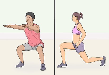 Incorporate squats and lunges into your workout to strengthen your legs. Keep your back straight and feet shoulder-width apart. To do a squat, bend your knees until they’re at a 90-degree angle. Hold the position for a count before standing up again. If you want to do a lunge, step forward with 1 leg and bend your knees at 90-degree angles. Push yourself back up to a standing position. Do 2–3 sets that are 10 reps each. Working out your legs prevents them from getting sore and exhausted while you’re in the middle of your hike. Hold dumbbells while performing squats or lunges if you want to build more muscle.