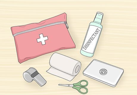 Keep an emergency kit in your pack in case of an accident. Include bandages and disinfectant so you can help with minor scrapes and cuts. Also pack a signal mirror, a piece of bright-colored cloth, and a whistle to make it easier to get someone else’s attention from a distance. Carry a headlamp with you just in case it gets dark so you can see the trail and are more visible to other people. Put matches and a pocket knife or multi-tool in the kit as well so you can start a fire and make repairs to your gear if you need to. If you’re planning a multi-day trip, plan on bringing a tent or emergency shelter as well.