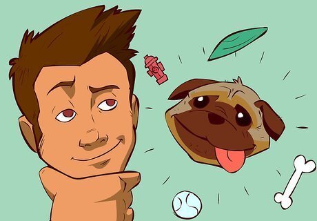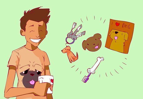 Buy dog paraphernalia. Stock up on t-shirts, stickers and posters of dogs. You don't have to spend a lot of money or buy anything in particular. If you're out and about and see something funny or cute that features a dog, go ahead and buy it. If you're on Pinterest, try doing a search for "cute dog stuff." There may be artwork, calendars or other items, which can provide you with inspiration for adding to your dog collection.