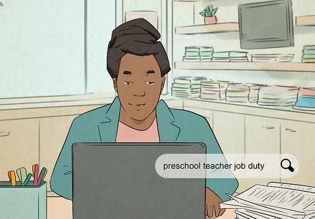 Research what preschool teachers do. Many people who want to become preschool teachers do so because they love working with children, but it is a very intense and grueling profession, often involving long hours crafting lesson plans or writing student evaluations. However, it is also an invaluable profession that helps the youngest students become lifelong learners. The following are among the content and skills you’ll be responsible for guiding students through: Learning to recognize letters and sounds Learning numbers and counting Learning the basics of writing Learning to follow directions, voice their needs, and socialize