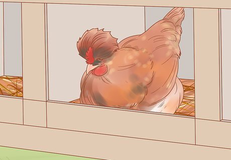 Separate broody hens if you're letting them hatch eggs. Create a separate nesting box for each hen and its egg. Line the box with straw before moving the chicken. Slip the fertilized egg underneath the chicken at night. Make sure the hen has plenty of food and water. Also, scoop droppings out of the box daily in order to keep the egg healthy. Broody hens can often sit on multiple eggs at the same time. This depends on the breed and the size of the eggs they lay. Some hens stay broody for weeks at a time. When this happens, you can replace the hatched egg with another fertilized egg. Some hens will hatch up to 8 eggs before they go back to normal.