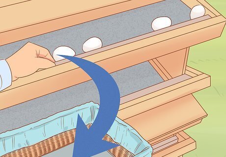 Collect the eggs in a clean, lined basket. Search through the coop to uncover the eggs. They may look a little dirty, but don't wash if you can avoid it. Washing the eggs may transfer bacteria to the growing chicken. Lay the eggs gently in your basket to carry around until you're able to store them or incubate them. Wash your hands before and after handling the eggs. Touching eggs with dirty hands may harm the new chickens. The eggs may also have dangerous bacteria on them that can harm you.