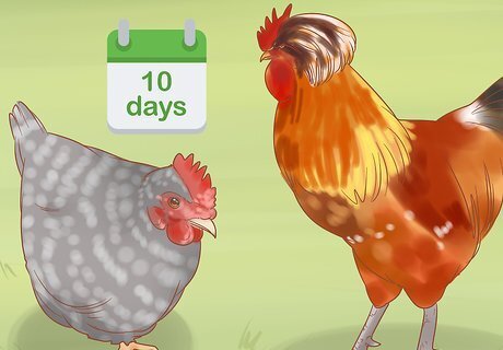 Keep your rooster and hen together for at least 10 days. Leaving them together for longer ensures the eggs get fertilized. Let the chickens roam around together or put them in a separate breeding pen. Separating them from the flock is important if you have other roosters. Eventually, your hens will lay eggs in their nest boxes. If you have multiple hens, leave up to 5 of them with your best rooster in order to get quality eggs. Keep in mind that some chicken breeds lay eggs more frequently than others. Also, hens lay the most eggs in the first 3 years of their lives.