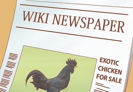 Search online or find local sources for breeding stock. Try to find breeders selling fully-grown adult chickens. You will need to select a hen and rooster in order to get your flock going. If you have room for additional chickens, consider getting extra hens so your flock breeds faster. Finding rare breeds can be difficult, so you may need to start with chicks. The animal classified section in your local newspaper may be a good place to find chickens for sale. Also, try asking at local feed stores, talking with local breeders, or attending poultry auctions. Importing is an option when a breed isn't common in your region. The all-black Ayam Cemani, for instance, is uncommon outside of Indonesia. Dealing with an experienced livestock importer is often the only way to get one.