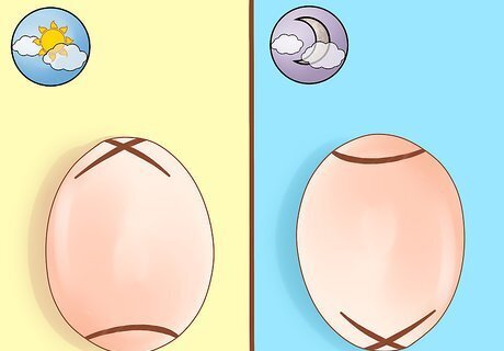 Mark the ends of the eggs to keep track of their positioning. The eggs need to be turned often to keep the chick inside from sticking to the shell. To keep track of the positioning, mark each egg with a pencil. For example, make an X on 1 side, turn the egg over, and make an O on the other. That way, you always know which way you need to turn the egg. You can make any marks you like, but choose symbols that are easy to distinguish.
