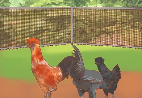Give your chickens plenty of space to roam around. Chickens leave the coop to roam around during the day. If your chickens aren't free-range, keep them enclosed inside a “run.” To build a run, install chicken wire buried about 2 ft (0.61 m) in the ground. On average, you need about 18 sq ft (1.7 m) of run space for every chicken you keep. Free-range chickens roam around without boundaries. This isn't possible when you're trying to keep your exotic breeds safe outside your home in the city. You do not need to have a farm to begin breeding chickens, although the extra space allows you to raise a bigger flock.
