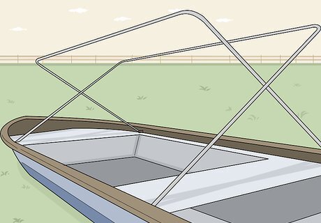 Screw U-shaped metal brackets in the 4 corners of your boat. Get U-shaped mounting brackets that are at least ⁄4 inch (1.9 cm) wide. Place your first bracket on top of the frame in the back of your boat near the motor, and drive a screw through it to secure it. Put the second bracket directly across from the first one on the opposite side of the boat. Place the last 2 brackets at the front of your boat before it starts to narrow, and screw them in so they run parallel with the back brackets. You can also attach the brackets to any boat seats or platforms if it’s easier for you. If you’re drilling through fiberglass, cover the area with painter’s tape first so you don’t crack or damage the boat.