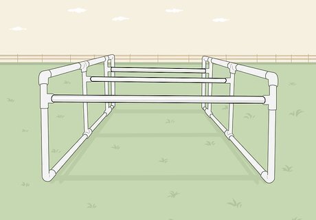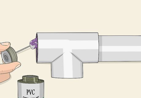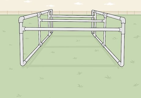 Glue the pieces back together using T-connections. Fit 2 sections of pipe into the side holes on a PVC T-connection so the top hole points up. Add another T-connection to the end so the top hole points up, and put the third section in the side hole so you have a long horizontal pipe. Once everything fits, apply PVC cement around the end of each pipe section and push it back into the T-connection to secure it. Repeat the process with the other sections of pipe. You can buy PVC cement from your local hardware store. A T-connection has 2 holes on the side and 1 on the top so you can join multiple pipes together. You don’t have to glue the pieces together if you don’t want to, but it reduces the risk of your frame falling apart while you’re using it.
