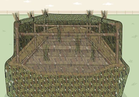 Attach blind grass onto the netting if you want additional camouflage. Blind grass simulates the natural plant life on the water and can help conceal your boat more. Lay out the blind grass on the outside of the netting and secure it in place every 6–12 inches (15–30 cm) with zip ties. Make sure the bottom of the blind grass extends past the top and bottom of your boat to hide it better. You can blind grass online or from hunting specialty stores. You can also use dead leaves and branches of the natural plant life in your area if you want.