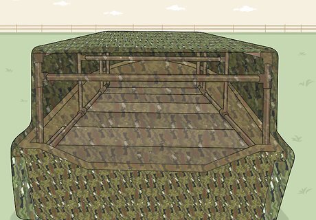 Paint the frame a matte brown or green color. Use spray paint that’s meant for exterior use and the material you built your frame from. Make sure to use a matte brown or dark green so it blends in with the rest of your camouflage. Hold the spray paint 6 inches (15 cm) from the frame and apply a thin coat in short bursts. Once you apply the first coat, wait about 15 minutes before applying another coat. Cover your boat with plastic or cardboard so you don’t accidentally get paint on it. You don’t need to paint the frame if you don’t want, but it will make it more difficult to see.
