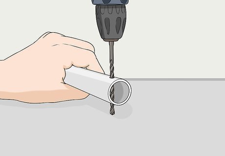 Drill holes in one end and the center of each conduit. Use a drill with a bit meant for boring through metal. Measure in 1 inch (2.5 cm) from one end of each conduit and drill your hole completely through the other side. Then, find the midpoint of each conduit and drill another hole through the pipe. Drill from the same side of your pipe for each hole, or else your frame won’t fit together. Be careful not to bend or damage the conduit while you’re drilling it.