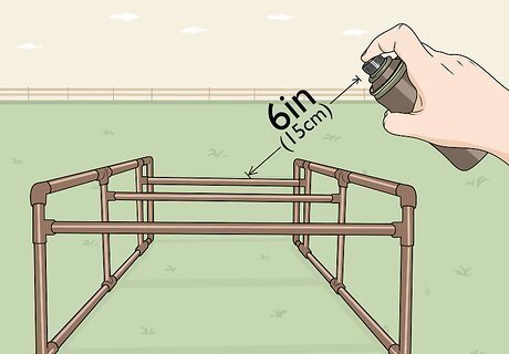 Install a top rail to the frame. The top rail uses the same size pieces as the bottom pieces of your frame. Take your length measurement from earlier and cut out 6 new sections of PVC pipe with your hacksaw to fit between the 4-way connections. Push the new pipe sections into the 4-way connections so they span the length of the boat and support your frame.
