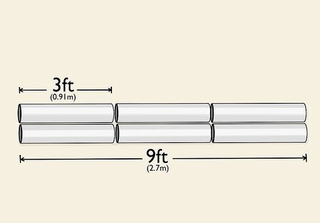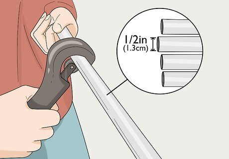 Split each length of PVC into 3 equal pieces. Take the measurement you found for the length and divide it by 3 to find how long each section should be. Mark the new measurements on your PVC pipes and cut through them with a hacksaw. Cutting your side pieces into smaller lengths lets you add side supports to your frame using T-connections so you blind is more sturdy. For example, if the inside length of your boat is 9 feet (2.7 m), then each section of pipe you cut will be 3 feet (0.91 m). If you want, you can cut the 3 pieces to size right away rather than cutting out the long pieces first.
