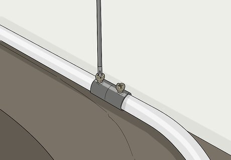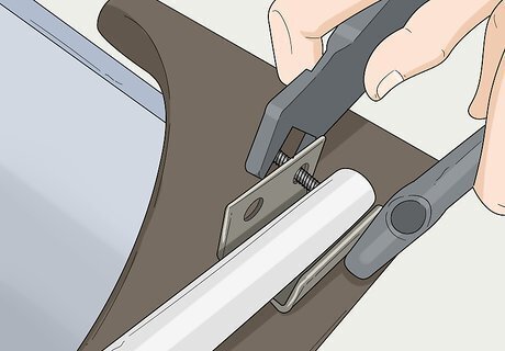 Attach the PVC pieces to the sides of your boat with conduit clamps. Get conduit clamps that match the size of your pipes to ensure a tight fit against your boat. Hold the length of pipe against the inside of your boat about 6 inches (15 cm) from the top edge. Measure every 2 feet (61 cm) along the length of pipe and make marks on your boat so you know where to place the clamps. Screw in the clamps with an electric screwdriver so they’re secured to your boat. Conduit clamps are rounded metal pieces that hold pipes in place so they don’t move around, and you can buy them from your local hardware store. You can also screw the conduit clamps into the boat seats if it’s easier than attaching them to the side of your boat. If you’re drilling through fiberglass, then cover the area where you’re making your hole with painter’s tape before you start drilling so you don’t accidentally crack or damage your boat.Tip: Don’t put the clamps too low on the boat’s body since you could cause leaks. Always install them 6 inches (15 cm) or less from the top edge.