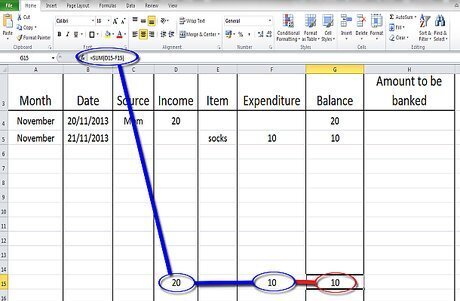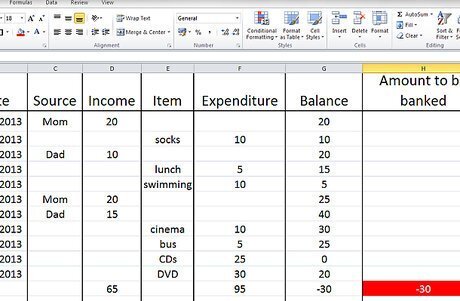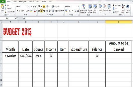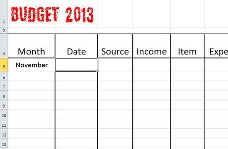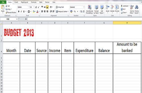 Add the following headings, each heading a column: Month, Date, Source, Income, Item, Expenditure, Balance, Amount to be Banked.