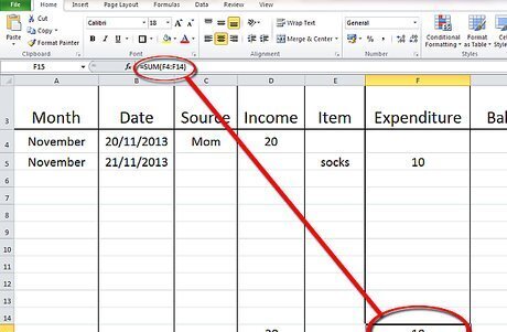 Write the same sum, with a different set of column numbers e.g. (F4:14) in the same row in your EXPENDITURE column.