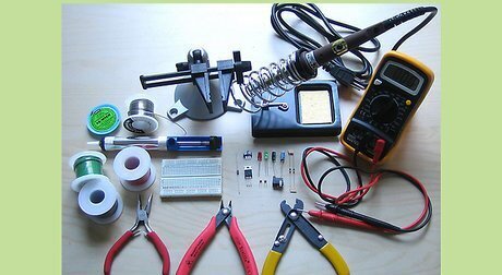 Obtain materials. Most kits include all required parts, including circuit boards, components and even solder. Tools however, are not. Bare minimum would be a low wattage pencil style soldering iron with a small chisel or point tip. There is no need for an iron rated more than 30 or 40 watts. A stand or holder for the soldering iron will help keep it from burning surfaces and from rolling away. A solder wick is braided copper "wire" that when laid on cold solder and heated, will wick excess solder away. This is a handy item to have, especially for those who have never soldered before. A tinning compound is used to prepare a new soldering tip for first use. It is also used to clean the tip as it gets dirty. Most of these items are available in a soldering tool kit at Radio Shack and other electronics stores.