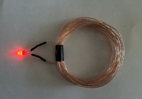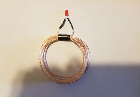 Attach the LED to the receiver coil. Wrap the one of 1-inch leads we left on the receiver in the previous step around either of the LED leads. Repeat for the remaining leads. Wrap tape around each connection to secure in place. You will notice that the leads of the LED are different lengths: one is the positive anode, the other is the negative cathode. The longer of the two is the anode. In this application it won't matter, but good to know either way.