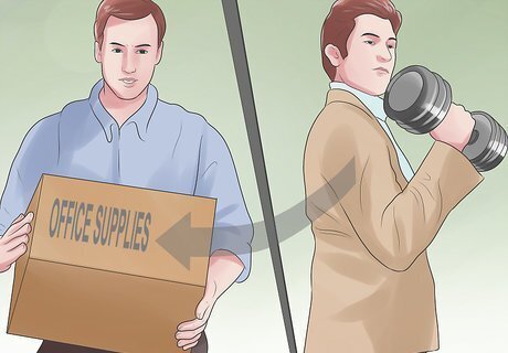Start a mini workout club at the office. Any workout is easier when you have people by your side to support and encourage you, so, if you can, consider starting a workout group at your office with some of your coworkers. This practice is actually already fairly common within smaller companies or start-ups. As part of your routine, you might, for instance, designate 15 minutes before lunch every day for mini-workouts focusing on rotating muscle groups - Monday, Wednesday, and Friday you could focus on arms and have "push-up club", whereas Tuesday and Thursday you could focus on abs and have "abs club". Alternatively, you might agree to play a round of pick-up basketball after work every day. The choices are endless, limited only by the tastes of you and your coworkers. If your boss allows you to, you may want to try advertising for your workout club in break areas, during lunches, etc.