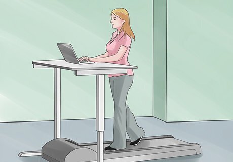 Work at a treadmill. Even better for your physical health than a standing desk is a treadmill desk or walking desk. Working at a treadmill allows you to experience mild exercise as you work - in addition to burning calories, you may find that walking as you work even boosts your energy and motivation levels. Walking desks are commercially available, though they can be somewhat pricey. If you have access to a normal treadmill, a more affordable option is to buy (or make, or improvise) a special stand that allows you to prop a laptop on the sloped surface of most treadmills. You don't have to jog or even break a sweat to get the benefits of working at a treadmill, but the faster you go, the more calories you'll burn.