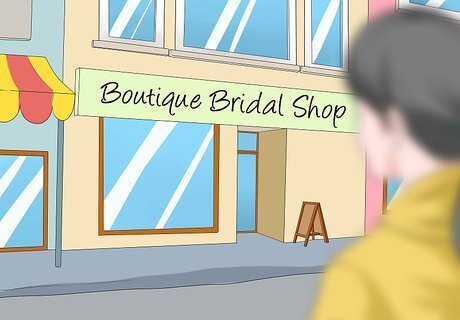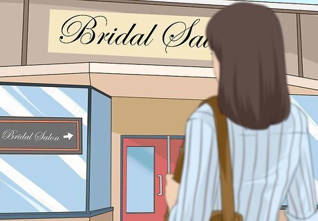 Research your local shops. Find out where all your local dress shops are, and research their styles, price range and quality. Read reviews and compare them, taking in what others say about their dresses and service. Bridal salons are usually the most expensive option, but they provide personal bridal consultants who can help you find the right dress. In addition, you can try on dresses to see how they look on you, not just in a picture. Salons usually have seamstresses on site to do any alterations you need.