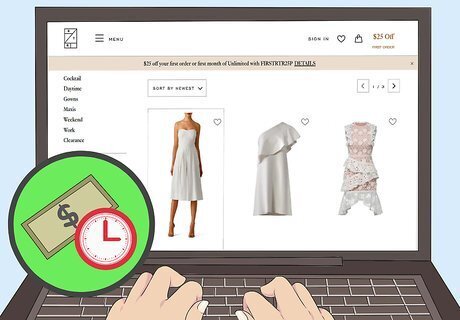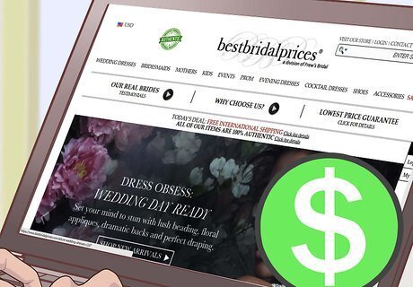Buy your dress online. There are several good wedding dress outlets online, such as Best Bridal Prices, PreOwned Wedding Dresses and Once Wed, as well as resale options, such as eBay and Craigslist. These sources allow you to purchase a new or almost-new dress at a steep discount to a full-service local shop. Make sure you have accurate measurements. Because wedding gown sizing can vary significantly, you'll want to compare your actual measurements to those listed for the dress. It can take just as long to receive a dress from an online site as it does from a brick-and-mortar boutique, so don't wait for the last minute. Check return policies before purchasing. All sales are final at many online wedding outlets, but some might allow you to return unworn and unaltered dresses within a certain number of days. Those being sold on eBay or Craigslist are rarely returnable. Use secure payment options. Unfortunately, the internet is full of scam sites. You need to be careful.