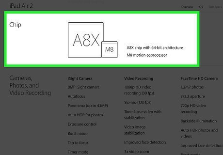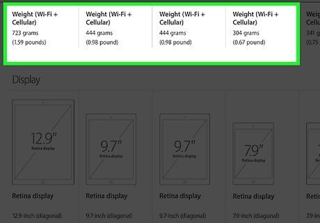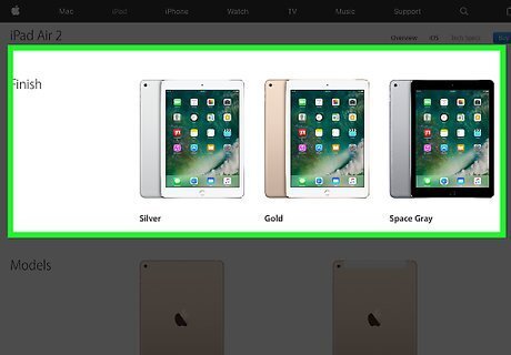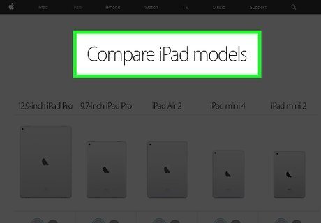 Compare the different iPad models. With your ideal criteria in mind, consider the aspects of the following tablets: iPads 1, 2, 3, and 4 - The original iPads (commonly referred to as the "iPad 1/2/3/4") are no longer in factory production as of January 2017, but you can usually find them for a discounted price on Amazon, eBay, and Craigslist. iPad Minis 1, 2, 3, and 4 - The iPad Mini line of tablets have a smaller, 7.9 inch display (as opposed to the traditional 9.7 inch display). The iPad Minis 2, 3, and 4 come equipped with high-definition Retina displays. iPad Air 1 and 2 - The Air series of iPads is a continuation of the original iPad line. They have 9.7 inch Retina displays as well as upgraded processors from the iPad Mini series. iPad Pro (9.7 inch and 12.9 inch) - The iPad Pro line is geared towards optimal performance, making them both the fastest-operating and the most expensive iPads on the market. Both the 9.7 inch and the 12.9 inch models have Retina displays, though the 9.7 inch model is the only iPad that can record video in 4K definition.