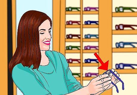 Try on a variety of styles and sizes. One of the perks of buying glasses from an optometrist rather than online is that you can actually try on the glasses and see how they look on your own face before you purchase them. Spend some time browsing the various shapes and styles in the store. Another perk is that the optician can accurately measure the distance between your eyes, which is an important measurement to get ideal vision with your glasses. Ask the optician for advice if you are having trouble deciding. They are trained in how glasses should fit and feel (like being able to see at least some of your eyebrows over the tops of the frames). In addition, they can help you to choose a lens, such as transitions or polycarbonate, according to your needs.