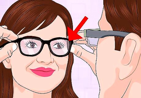 Come in for a fitting. When your glasses arrive at your optometrist's office, they will call you in to come pick them up. While you are in the office, the opticians will make sure that your new glasses are fitted perfectly for your specific measurements. They are trained professionals and know how to make little tweaks and adjustments to ensure a perfect fit. When considering the fit, you should make sure the glasses don't slip off your face when you look down. They also should not press too tightly behind your ears. If at any time you feel like the fit is wrong, you can return to your optometrist's office for adjustments. Most optometrists offer free fitting adjustments while the glasses are in their warranty period — usually this lasts for one year.