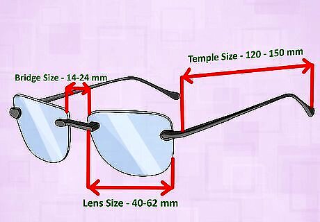Figure out your frame size. For glasses to fit perfectly, you'll need to know what your frame size is. You can find these measurements on your existing glasses (if you like the way they fit) or go in and get measured at a store that sells glasses. On your existing glasses, these measurement numbers can be found either on the temple part of the arms of the glasses or on the bridge that runs across the nose piece. The important measurements (in millimeters) include: Lens size. This is a two-digit number ranging from 40 – 62. Bridge size. This is a two-digit number ranging from 14 – 24. Temple size. This is a three-digit number ranging from 120 – 150.