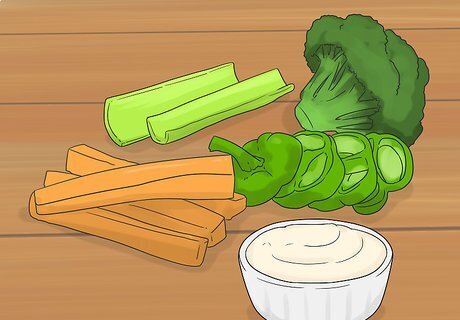 Snack on vegetables and gluten-free dips. Like fruits, vegetables will never contain gluten, and so are a reliable snacking option. Carrot sticks, celery, sliced bell peppers, and broccoli are a few popular vegetable snacks. If you'd rather not eat your vegetables plain, you can easily find a gluten-free dip to eat them with. Pairing vegetables with hummus, nut butters, flavored cream dips, salad dressing, or chunks of cheese can offer healthy gluten-free snack options. Whole fruits, nuts, rice cakes, and salads are healthy, filling, and often gluten-free.