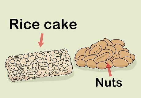 Shop for nuts and rice cakes. These products are typically gluten free, since they do not contain wheat or any grain products or byproducts. Nuts can be found in either salted or non-salted variety; either makes for a tasty snack. If you have access to a large grocery store, you should be able to find plenty of varieties of nuts: peanuts, cashews, macadamia nuts, walnuts, pecans, and almonds are a few popular varieties of nut. Rice cakes are generally light and low on calories, and can be found in a variety of flavors.