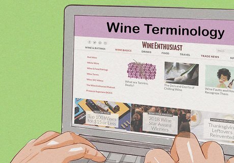 Familiarize yourself with wine terminology. To know how to buy good wine, whether it’s on a budget or not, you’ll need to know how to read and talk about wine. Learn how wine is discussed among connoisseurs and in descriptions of wine to know how to shop for quality in your wine as well as price. For example, connoisseurs will use words like “balance,” “blended,” and “length” to describe the sensations involved in drinking wine. Refer to a “wine glossary” website like WineMag or Vinology to understand what these words mean in the specific context of drinking wine. Many reviews of wine will be heavy with terms that refer to the “5 Ss” of wine: seeing, swirling, sniffing, sipping, and savoring. For example, words like “dark,” “smoky,” “body,” or “crisp,” are often used in reviews to refer to the sight, taste, smell, or texture of wine.