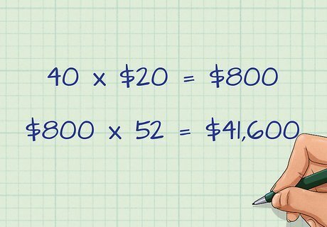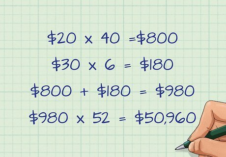 Calculate your yearly pay if you work the same number of hours per week. Take your hourly salary and multiply it by the number of hours you work each week. This tells you your weekly salary. Multiply this by the number of weeks in a year, 52, to get your yearly salary. If you work 40 hours per week and you earn $20 per hour, calculate your weekly salary with the equation 40 ∗ $ 20 = $ 800 {\displaystyle 40*\$20=\$800} 40*\$20=\$800. Then calculate your annual salary with the equation $ 800 ∗ 52 = $ 41 , 600 {\displaystyle \$800*52=\$41,600} \$800*52=\$41,600.