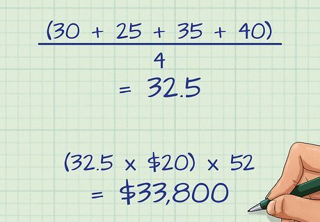 Find the average if you work a different amount each week. If your hours vary every week, keep track of your weekly hours for about one month. Then calculate the average number of hours you worked each week. Multiply that by 52 to find your annual salary. If in one month you worked 30 hours the first week, 25 hours the second week, 35 hours the third week and 40 hours the fourth week, the average weekly hours is ( 30 + 25 + 35 + 40 ) / 4 = 32.5 {\displaystyle (30+25+35+40)/4=32.5} (30+25+35+40)/4=32.5. If you earn $20 per hour, then your estimated annual salary is ( 32.5 ∗ $ 20 ) ∗ 52 = $ 33 , 800 {\displaystyle (32.5*\$20)*52=\$33,800} (32.5*\$20)*52=\$33,800.