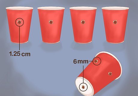 Punch holes in small paper cups. Take four small paper cups, and punch a single hole in each one, about ½ inch (1.25 cm) below the rim. Take a fifth cup, and puncture four evenly spaced holes, about ¼ in. (6 mm) below the rim, then punch a fifth hole in the center of its base. You can use a pencil to punch these holes, if you don't have anything sharper.