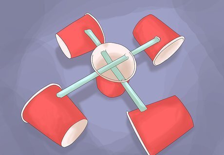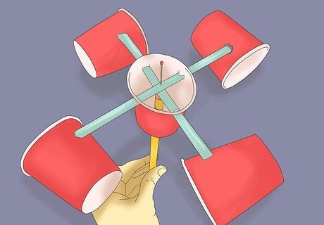 Make a base for the anemometer. Slide the two straws until all four cups are the same distance from the center. Stick a small pin through the intersection of the two straws. Stick the eraser end of a pencil through the hole in the base of the central cup, and push it gently onto the pin. You can now hold the anemometer by the pencil tip, and use it to measure wind speeds.