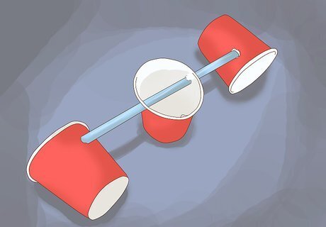 Construct one half of the basic shape. Stick a plastic straw into a single-hole cup, about 1 inch (2.5 cm) into it. Push the other end of the straw through two holes of the five-hole cup. Stick the free end of the straw into another single-hole cup. Turn the two single-hole cups so they are pointing in opposite directions, along the same plane as the straw. Staple the straw to the cup.